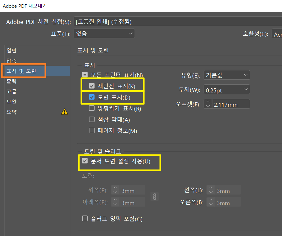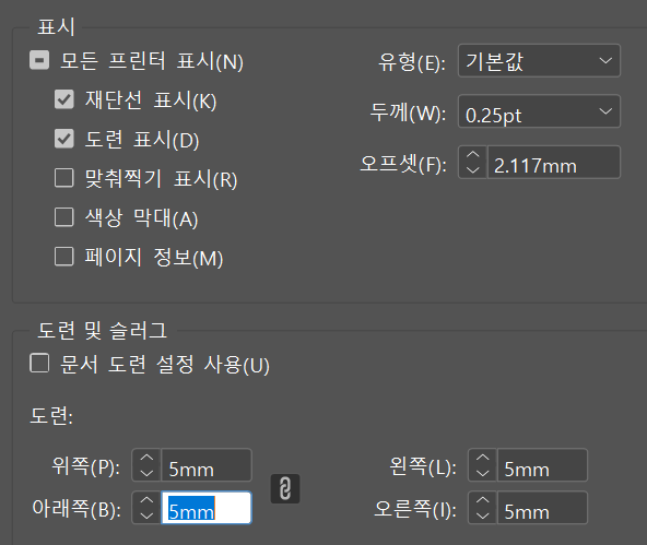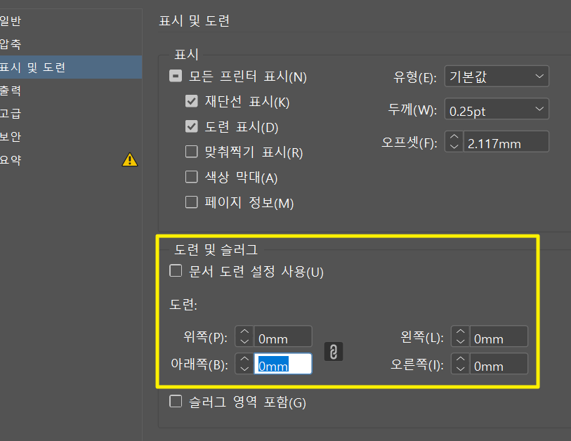 문서 도련 설정 사용을 누르면 작업시 설정한 3mm대로 무조건적으로 나온다.